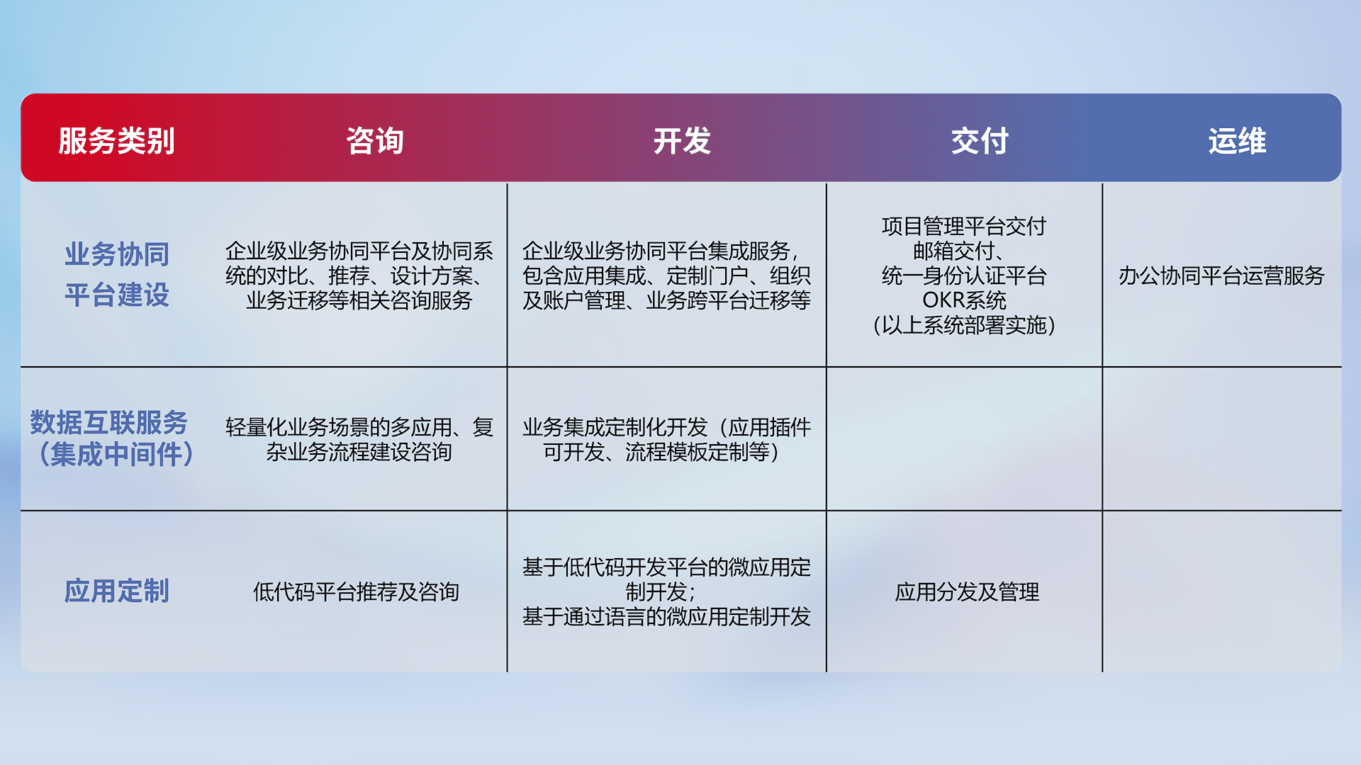针对钉钉、、企微、、IDaas等平台级产品提供产品的规划、、、、方案、、交付、、、定制化开发等服务,,,,实现如统一协同办公、、、智能客户服务、、、混合会议管理、、、、智能数据查询、、、等业务场景,,,,实现数字化转型。。